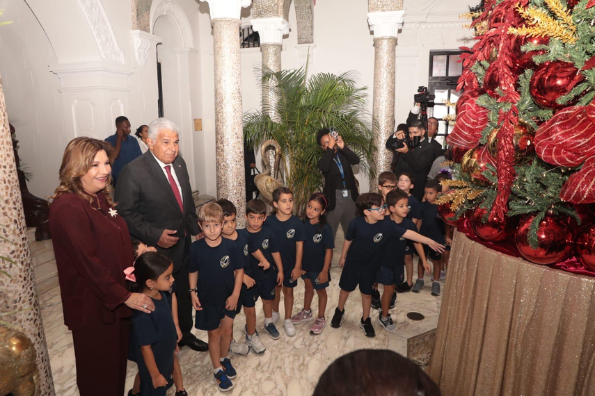 El presidente de la República, José Raúl Mulino, hizo una pausa en su agenda de trabajo para recibir, junto a la primera dama Maricel Cohen de Mulino, a un grupo de niños y niñas de prekínder y kínder de la Academia Interamericana de Panamá, quienes visitaron este viernes el Palacio Presidencial.