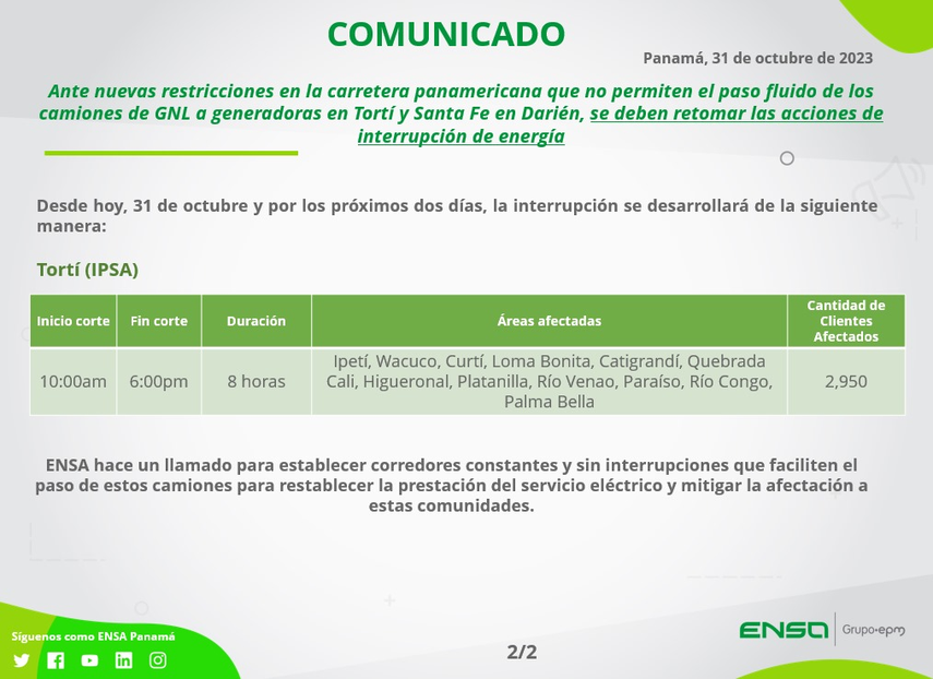 ENSA destaca que si no se permite el acceso al transporte de combustible por la carretera Panamericana hoy, IPSA solo podrá brindar el servicio de generación eléctrica hasta agotar las reservas actuales de combustible. En el caso de Santa Fe, solo se cuenta con reservas hasta mañana, 1 de noviembre, a las 7:00 a.m.