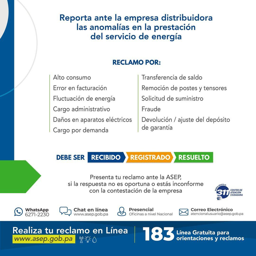La devolución o ajustes del depósito de garantía, también pueden ser reportados tanto en la Autoridad como en las compañías. Todos deben ser recibidos, registrados y resueltos por las empresas que prestan el servicio eléctrico remarca la ASEP.