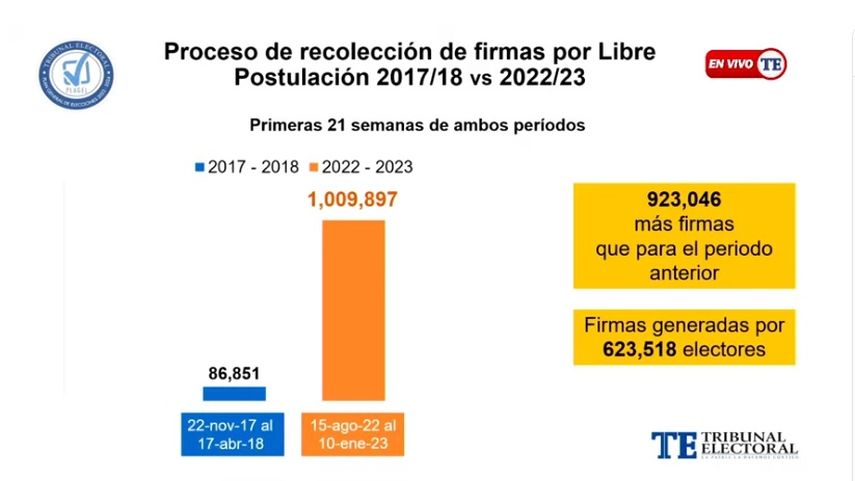 Como dato histórico, el magistrado cita que hasta el momento y durante 21 semana, desde el 15 de agosto del 2022 hasta el 10 de enero del 2023, se ha recabado unas 1,009,897 firmas, cifras que sobrepasan a lo recogio en el mismo periodo del proceso electoral que comprendía del 22 de noviembre del 2017 al 17 de abril de 2018 con 86,851 firmas.