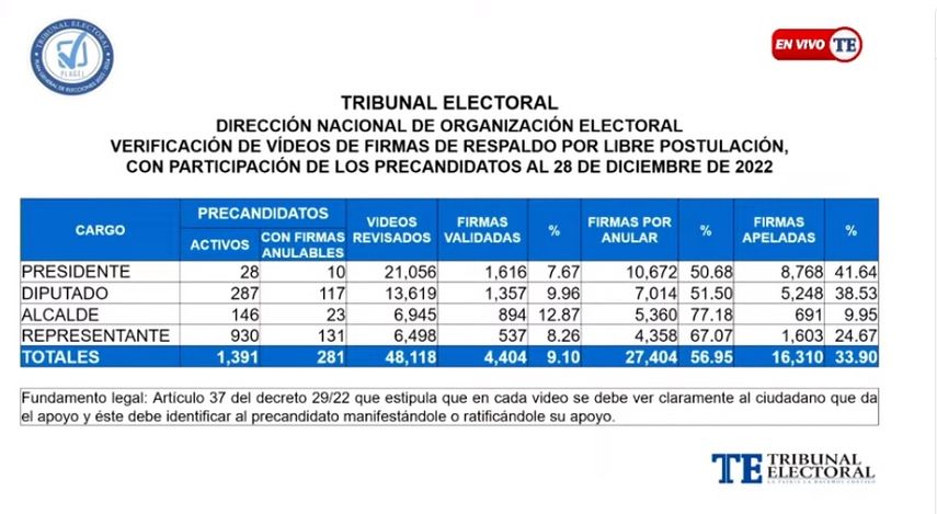 Además acotó que de los 48,118 videos revisados a los precandidatos se les reconoció 4,404 de las firmas investigadas, acordaron anular 27,404 firmas y hay 16,310 firmas apeladas, las cuales se elevarán a otras instancias para su validación.