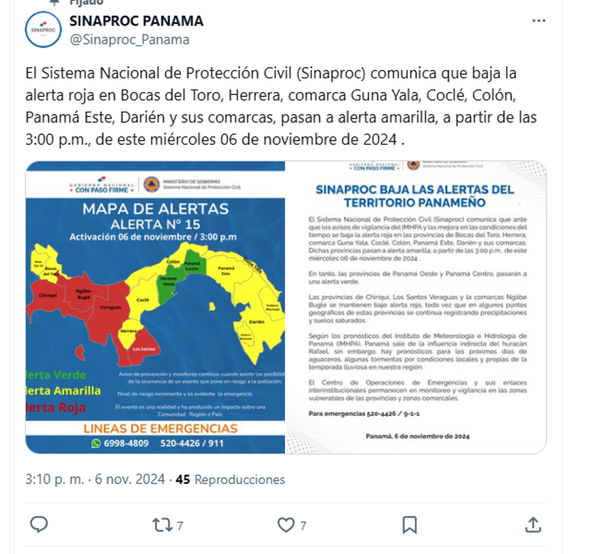 El Sistema Nacional de Protección Civil (Sinaproc) informó que a partir de las 3:00 p.m. del miércoles 6 de noviembre de 2024, la alerta roja se reduce a alerta amarilla en varias regiones del país, luego de evaluar las condiciones climáticas y su impacto en las zonas afectadas.