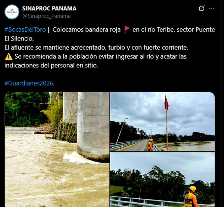 El Sistema Nacional de Protección Civil, SINAPROC, colocó bandera roja en el río Teribe, específicamente en el sector de Puente El Silencio, en la provincia de Bocas del Toro, debido al incremento del caudal del afluente.