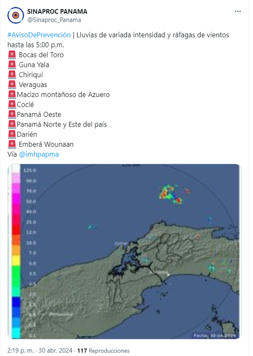 El Sistema Nacional de Protección Civil (SINAPROC) emite un aviso de prevención ante condiciones climáticas adversas en varias regiones de Panamá. Se esperan lluvias de variada intensidad y ráfagas de vientos hasta las 5:00 p.m. Se insta a los residentes en áreas afectadas a tomar precauciones y mantenerse informados sobre la situación meteorológica.