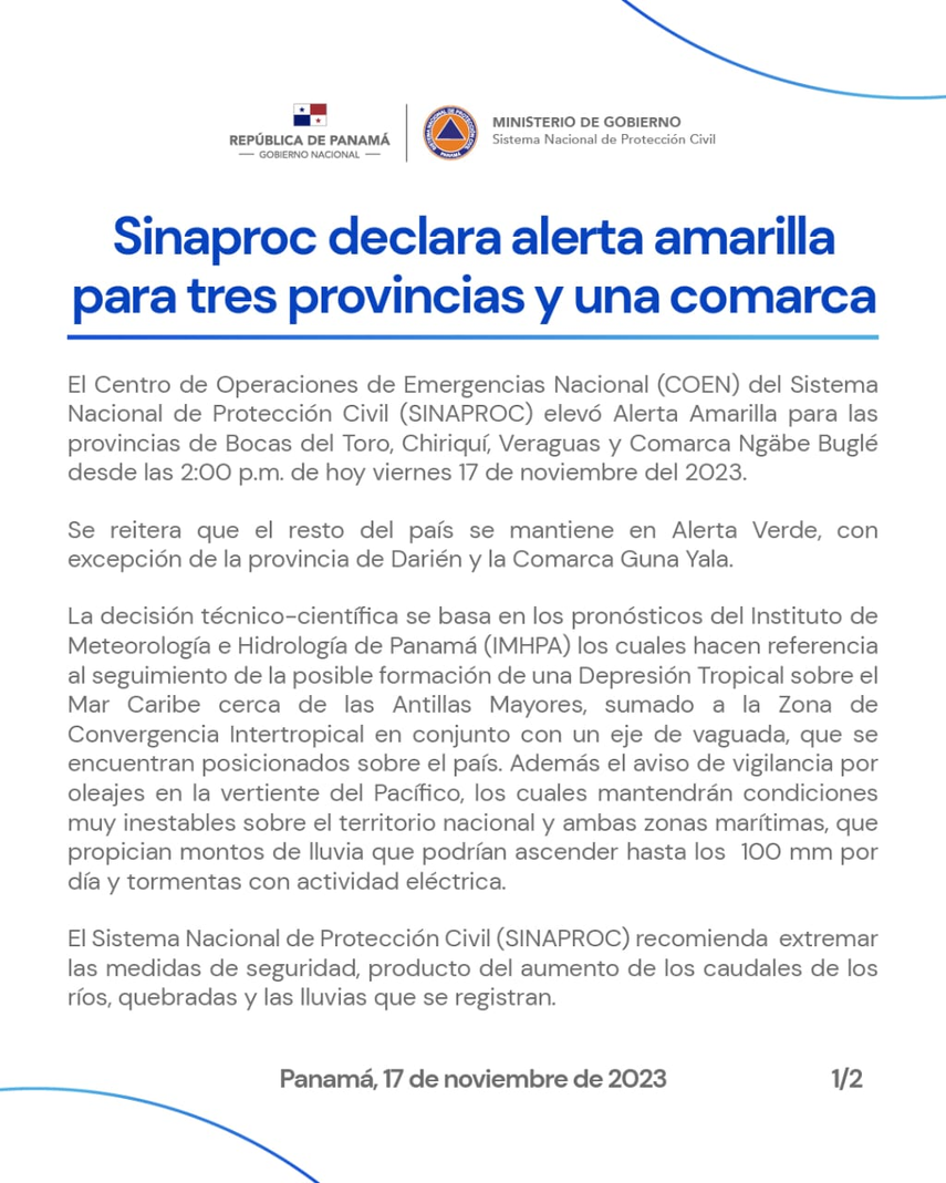 El Centro de Operaciones de Emergencia Nacional del Sistema Nacional de Protección Civil (SINAPROC) ha declarado alerta amarilla en las provincias de Bocas del Toro, Chiriquí, Veraguas, y Comarca Ngäbe Buglé a partir de las 2:00 p.m. de este viernes 17 de noviembre.