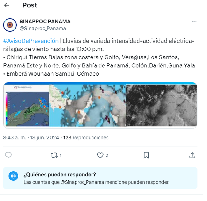 El SINAPROC emite un aviso de prevención por lluvias de variada intensidad, actividad eléctrica y ráfagas de viento hasta las 12:00 p.m. Se encuentran bajo este aviso las siguientes zonas: Chiriquí Tierras Bajas (zona costera y Golfo), Veraguas, Los Santos, Panamá Este y Norte, Golfo y Bahía de Panamá, Colón, Darién y Guna Yala, así como Emberá Wounaan Sambú-Cémaco.
