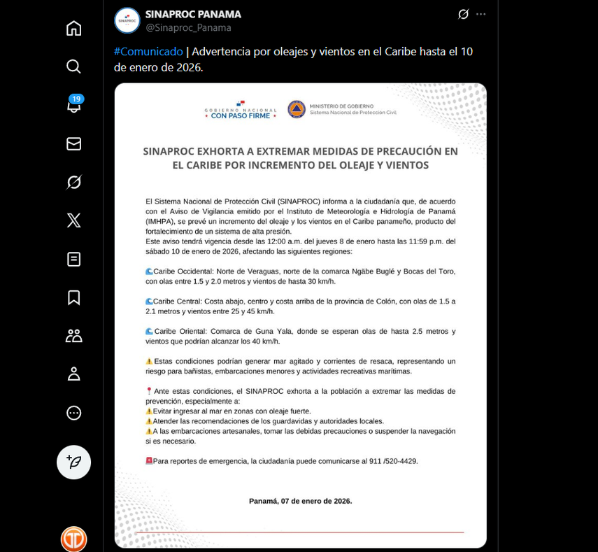 El Sistema Nacional de Protección Civil (SINAPROC) alertó a la ciudadanía sobre un incremento del oleaje y los vientos en el Caribe panameño, de acuerdo con un Aviso de Vigilancia emitido por el Instituto de Meteorología e Hidrología de Panamá (IMHPA).