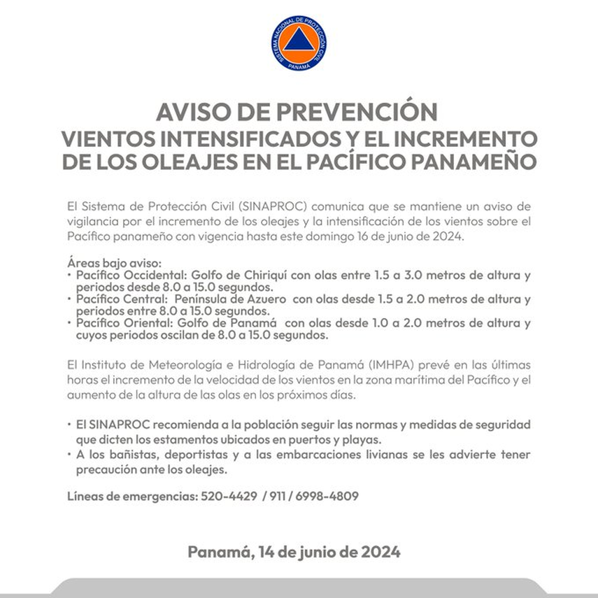 El Sistema Nacional de Protección Civil (SINAPROC) ha emitido un comunicado informando sobre la continuación de un aviso de vigilancia debido al aumento de oleajes y la intensificación de los vientos en el Pacífico panameño. Esta alerta estará vigente hasta el domingo 16 de junio de 2024.