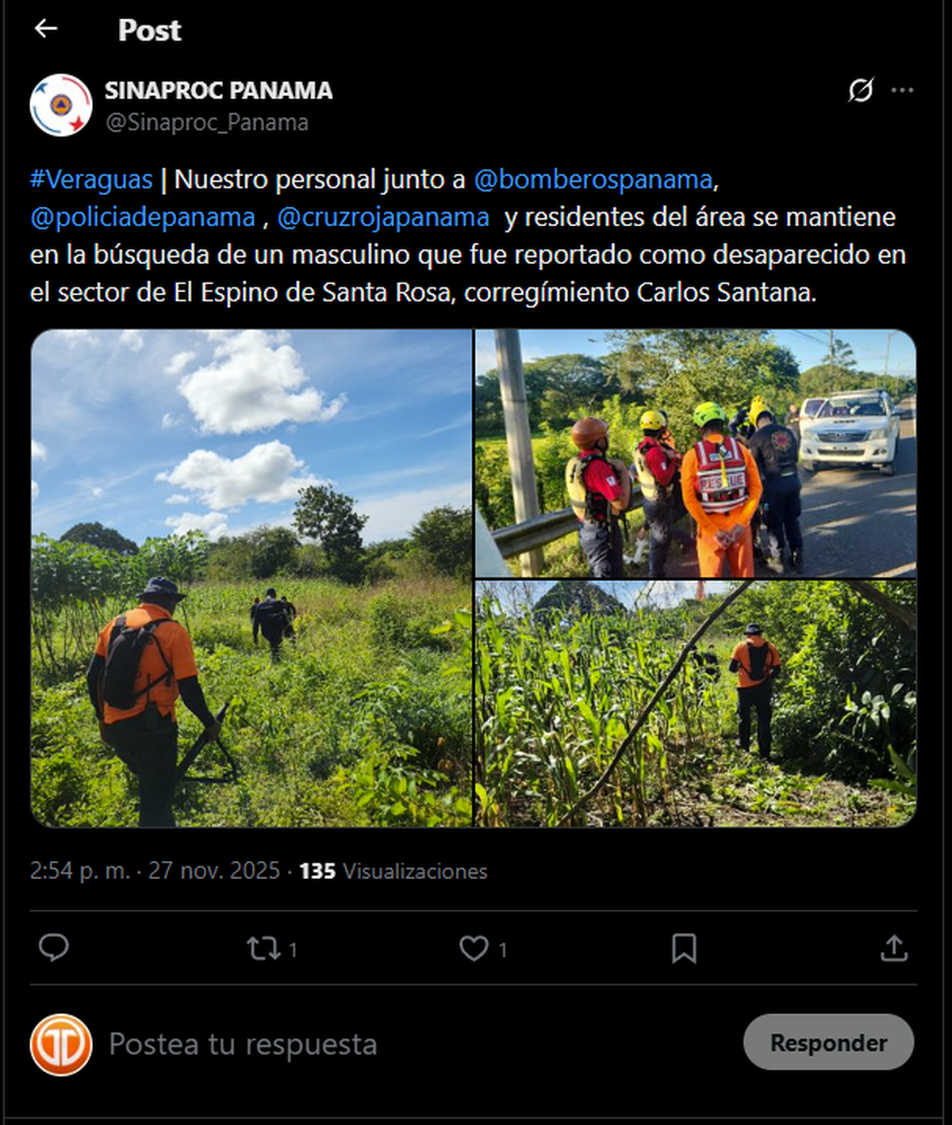 El Sistema Nacional de Protección Civil (SINAPROC), en conjunto con el Benemérito Cuerpo de Bomberos de Panamá, la Policía Nacional, la Cruz Roja Panameña y residentes del área, mantiene activa la búsqueda de un hombre reportado como desaparecido en el sector de El Espino de Santa Rosa.