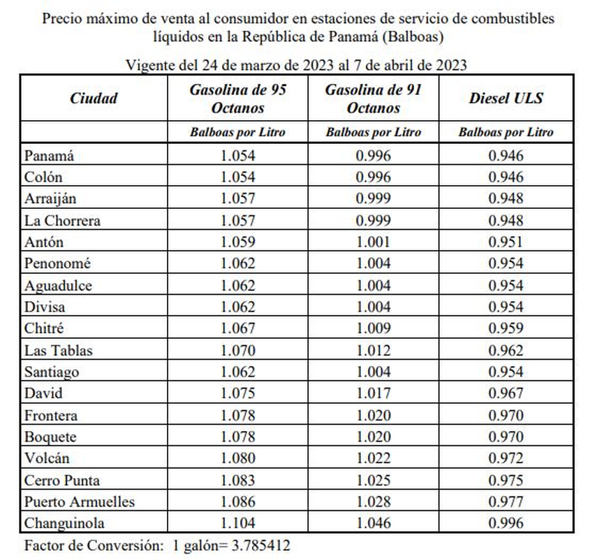 La Secretaría Nacional de Energía dio a conocer los nuevos precios máximos de venta de combustible líquidos en Panamá, los cuales serán válidos a partir del viernes 24 de marzo de 2023. Según la Resolución de la Gaceta Oficial, reflejan un aumento en la gasolina de 95 y 91 octanos mientras que el diésel bajará de precio. Cabe resaltar que hasta el 1 de abril del 2023, el Consejo de Gabinete de Panamá aprobó la extensión del subsidio del combustible de 91 y 95 octanos, adicional al diésel.