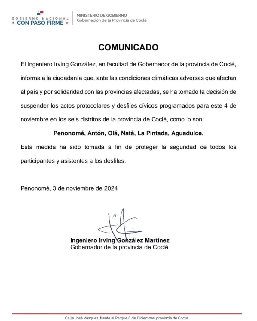 El gobernador de la provincia de Coclé, ingeniero Irving González, informó que, debido a las condiciones climáticas desfavorables que afectan al país y en solidaridad con las provincias impactadas, se ha decidido suspender los desfiles patrios en los seis distritos de Coclé: Penonomé, Antón, Olá, Natá, La Pintada y Aguadulce.