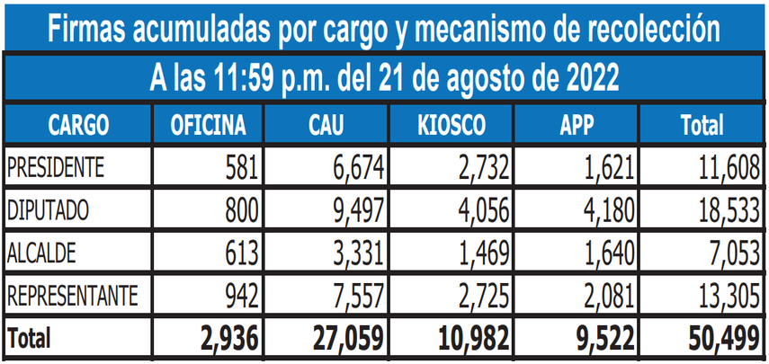 El Tribunal Electoral comunicó que hasta las 11:59 p.m. del domingo 21 de agosto de 2022 mantuvo un registro de 50,499 firmas para precandidatos por la libre postulación.