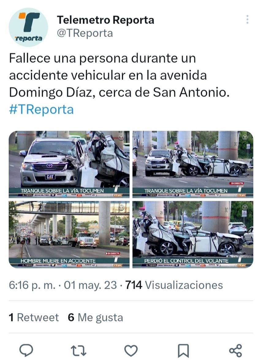 En la vía Domingo Díaz, con dirección hacia Panamá Este, a la altura de la comunidad de San Antonio, se registró un accidente de tránsito el cual dejó a una víctima fatal y personas lesionadas; por tal motivo, se registra en la vía tráfico pesado.