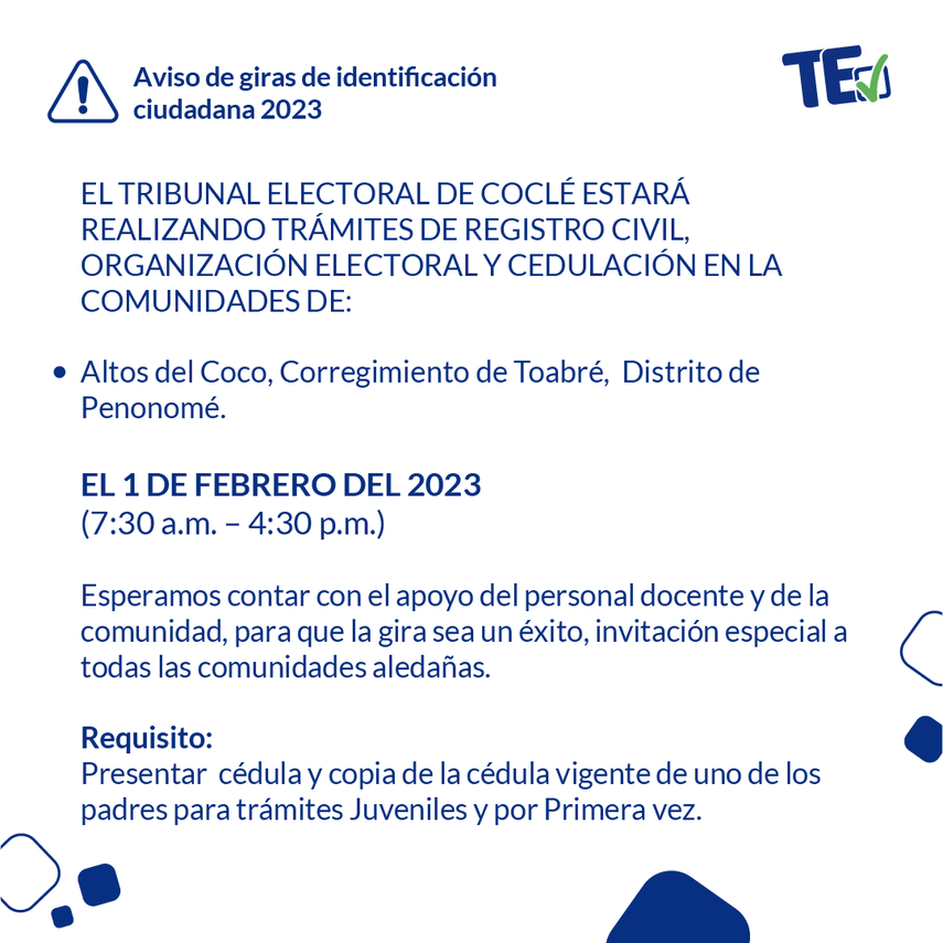 El Tribunal Electoral (TE), desde el miércoles 1 al domingo 5 de febrero del 2023, llevará a cabo giras de identificación ciudadana, donde se estarán tratando los procesos de registro civil y cedulación a los moradores de las comunidades que asistirán.