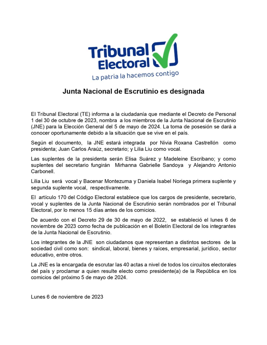 El Tribunal Electoral (TE) informa a la ciudadanía que mediante el Decreto de Personal 1 del 30 de octubre de 2023, nombra a los miembros de la Junta Nacional de Escrutinio (JNE) para la Elección General del 5 de mayo de 2024. Sin embargo, La toma de posesión se dará a conocer próximamente debido a la situación que se vive en el país.