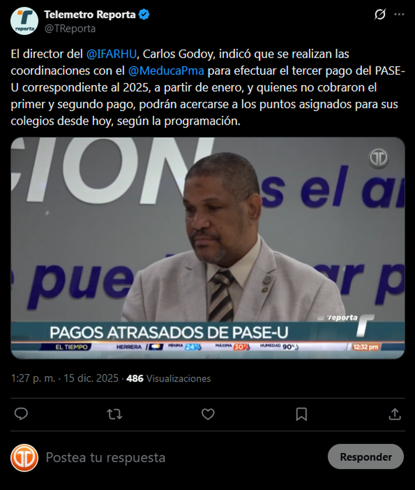 El Instituto para la Formación y Aprovechamiento de Recursos Humanos (IFARHU) anunció que se mantienen las coordinaciones con el Ministerio de Educación (MEDUCA) para realizar el tercer pago del PASE-U correspondiente al año 2025, el cual se estará efectuando a partir del mes de enero.