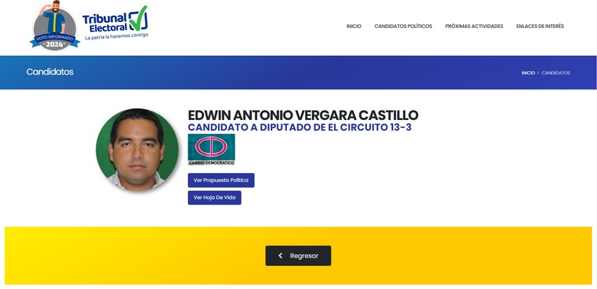 Edwin Vergara, representante de la alianza entre el Partido Panameñista y Cambio Democrático, ha sido confirmado como el diputado electo para ocupar la curul en la Asamblea Nacional por el circuito 13-3 de la provincia de Panamá Oeste, por los resultados extraoficiales de las elecciones 2024.