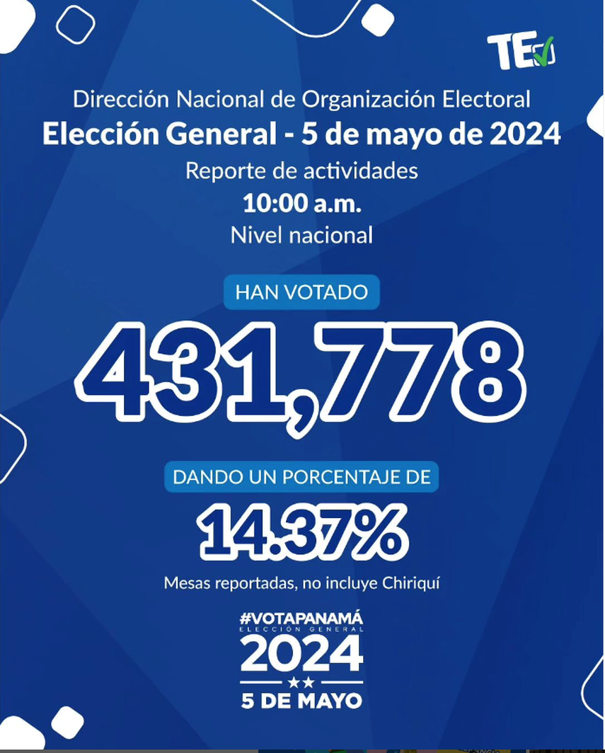 Hasta las 10:00 a.m. de este domingo, el Tribunal informó que 431,778 ciudadanos habían emitido su voto, lo que representa un porcentaje del 14.37% del padrón electoral, excluyendo la provincia de Chiriquí.