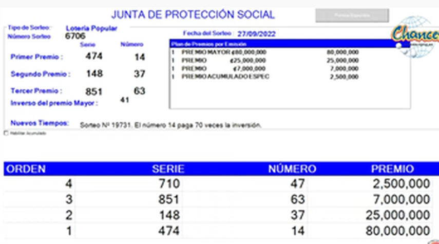 Este juego se realiza cada martes y viernes donde se sortean los Chances de Costa Rica, aunque los premios son variables.