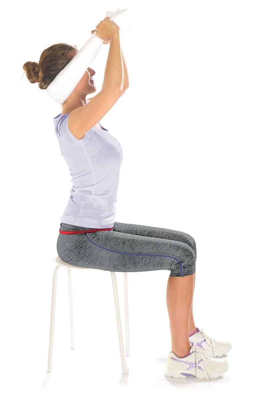 - Existe un ejercicio muy útil que te ayudará si sientes ese pesado dolor en el cuello, que te hace mantenerlo rígido. Primero, debes estar sentado en posición recta; luego, colocar una toalla pequeña en tu cuello, sujetarla con tus brazos y mantén la postura por unos segundos y sigue repitiéndolo tres veces.