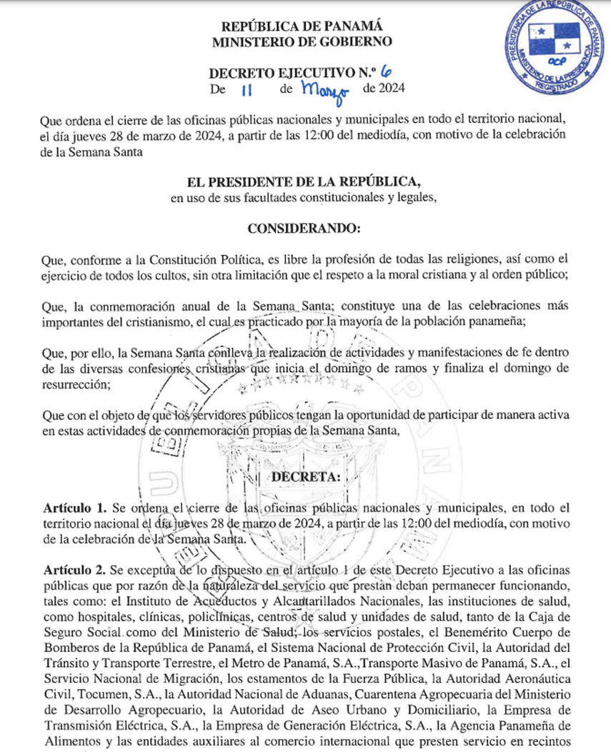 Según el Decreto Ejecutivo N°. 6 de 11 de mayo de 2024, el Gobierno Nacional ha ordenado el cierre de las oficinas públicas en todo el territorio nacional a partir del jueves 28 de marzo, desde las 12:00 medio día.