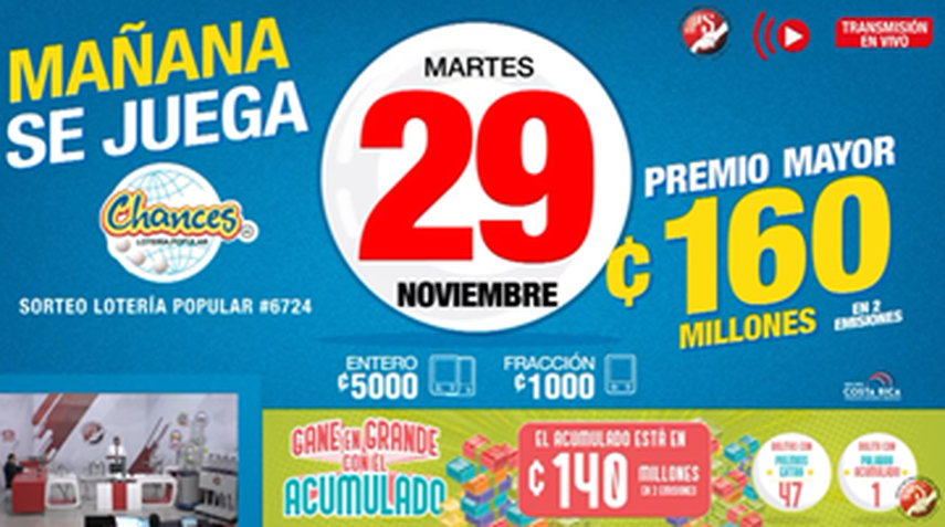 En esta ocasión, el premio mayor en el sorteo del Chance, será de 160 millones de colones que equivale a 252.424,64 dólares. ¡Suerte!