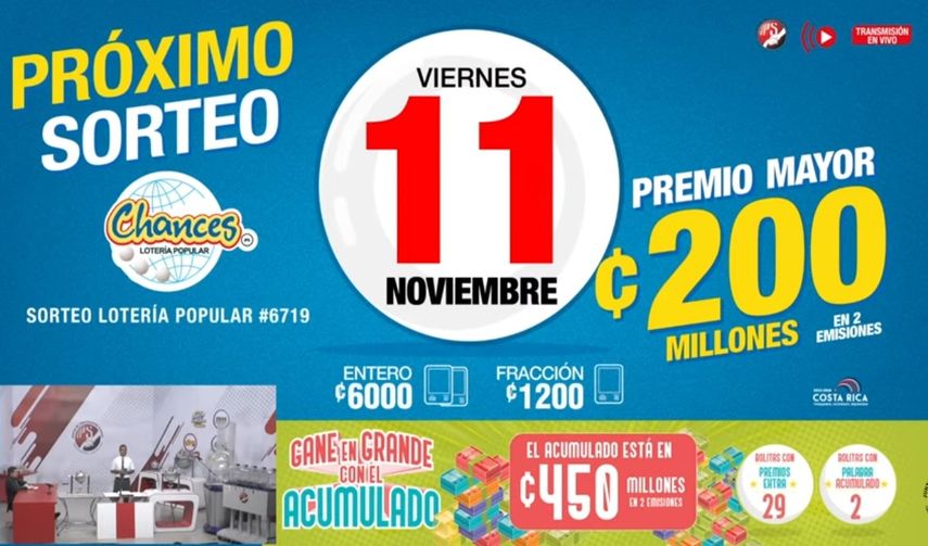 En esta ocasión, el premio mayor en el sorteo del chance, será de 200 millones de colones que equivale a 324.954.25 dólares. ¡Mucha suerte!
